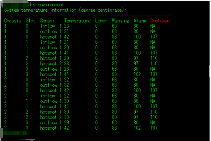 · hotspot:表示热点温度传感器 · inflow:表示入风口温度传感器 · outflow:表示出风口温度传感器 看下交换机上板卡对应下