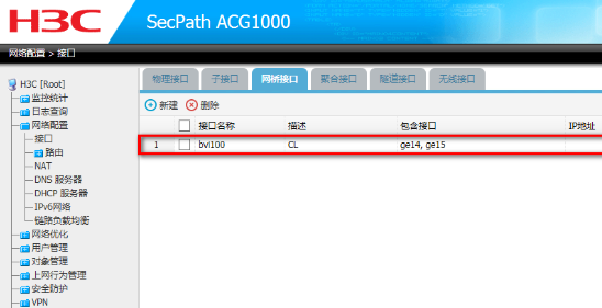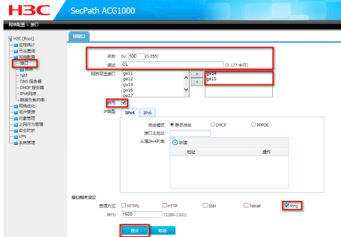 在“名称”这里起一个编号,将左侧ACG连接上下行接口划入到桥接口中,点击“提交”如下图所示: