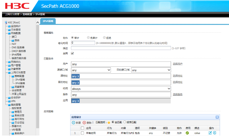 最后在菜单“上网行为管理”------->“策略配置”——>“IPv4策略”,创建一条允许所有流量的策略,配置如下图所示: