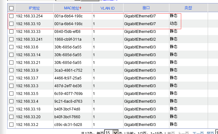 这个应该不是同一台设备被分配两个地址,上面的静态是静态绑定的表项