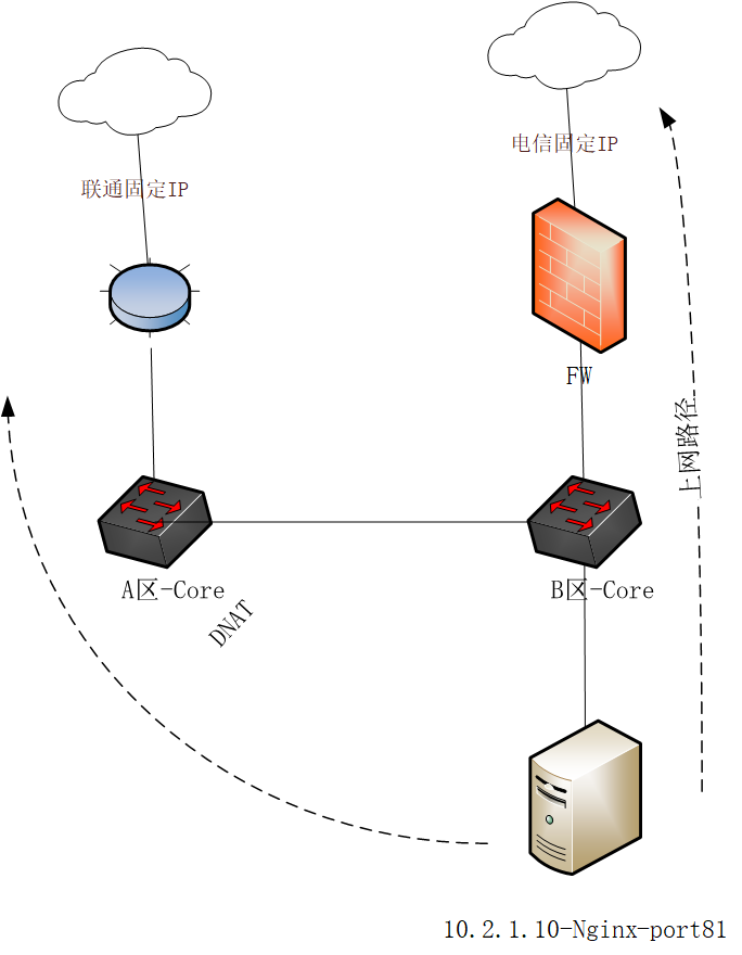 服务器访问外网从B区域出去,核心默认路由指向防火墙;
