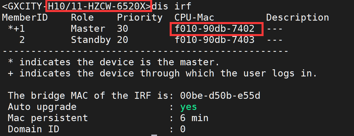 dis irf显示出来的CPU-Mac是每台设备的MAC地址,不是堆叠后的MAC地址,堆叠后的MAC地址要看这句The bridge MAC of the IRF is: 00be-d50b-e55d,这个才是堆叠后的MAC地址。