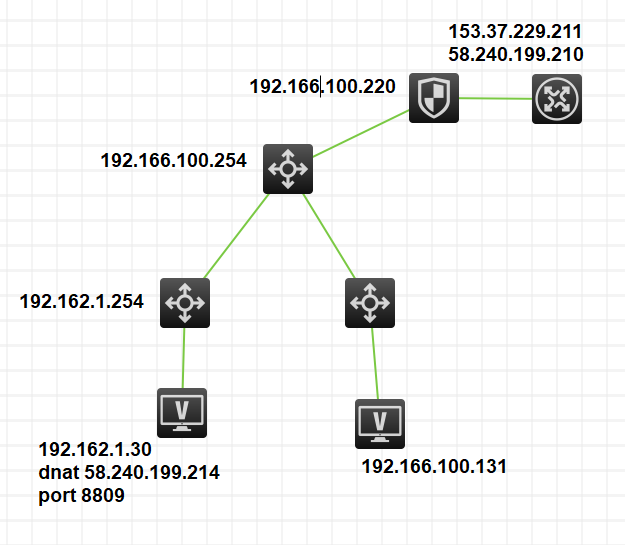 现场拓扑如下,用户将192.162.1.30的8809端口映射到fw的58.240.199.214的8809上,然后做了双向nat,发现外部可以访问,内部无法通过58.240.199.214的8809访问内部服务器,直接访问192.162.1.30可以
