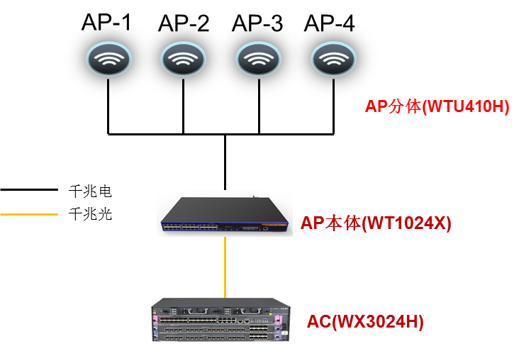AP在网络中使用二层注册方式,经过查阅相关资料WTU410H只支持version1也就是直通模式,当前在AC上将本体AP切换到version1模式并进行重启,AC上通过display wlan ap all命令查看发现本体AP已经自动注册,但没有看到AP分体;查看分体的供电情况指示灯也是亮绿色,进一步在AC上通过display arp interface ten-g1/0/1 命令查看AC下连口的ARP信息,发现存在5条ARP信息证明分体式可以获取到AC上地址的,通过在AC上也能ping通5个ARP信息当中的地址。