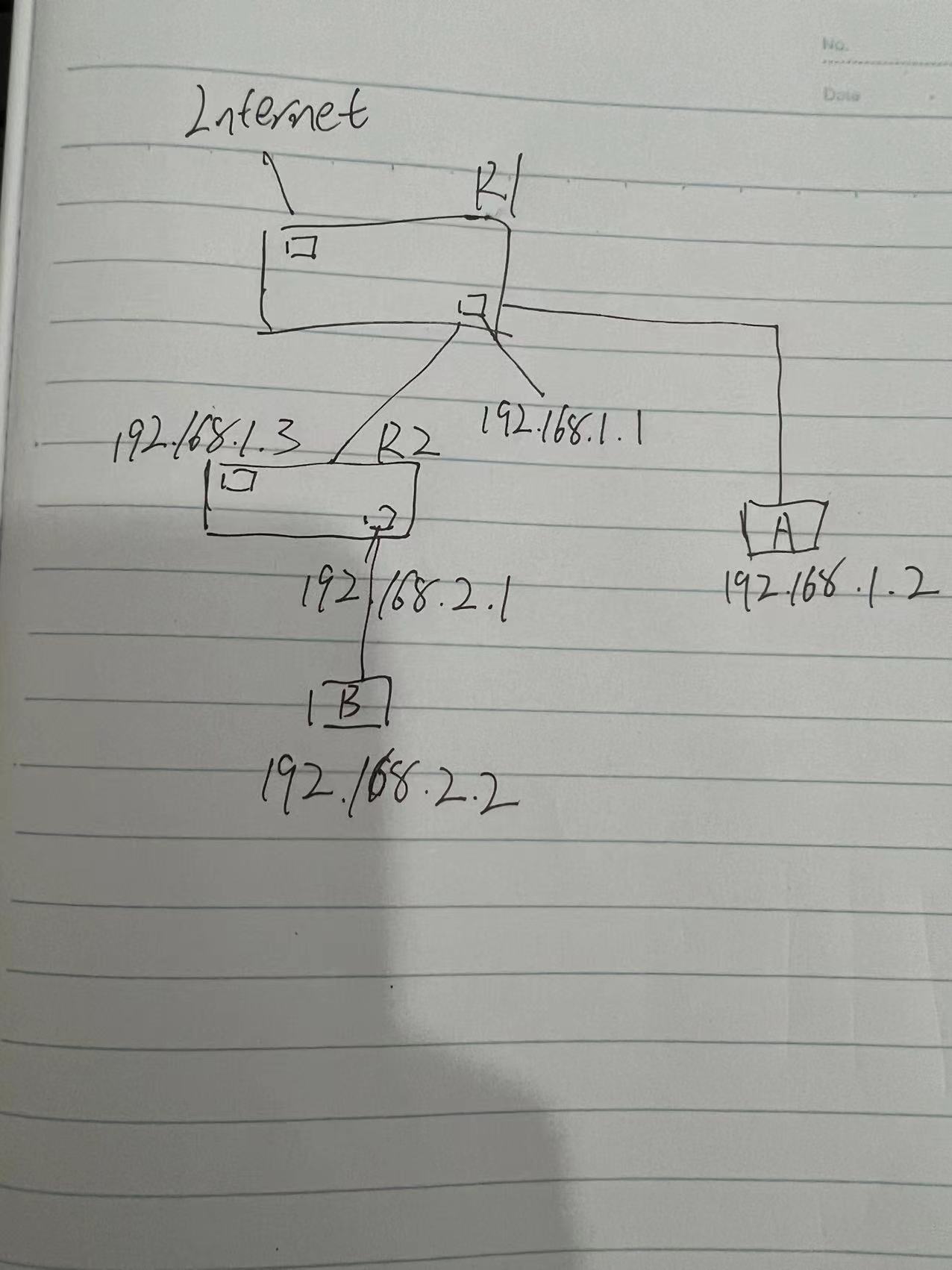 主路由R1下接了R2,R1LAN口IP为192.168.1.1。R2WAN口IP为192.168.1.3,LAN口IP为192.168.2.1。在R1上写了静态路由 192.168.2.0 255.255.255.0 192.168.1.3,但是好像不生效,R1 下的主机1.2还是ping不通2.1