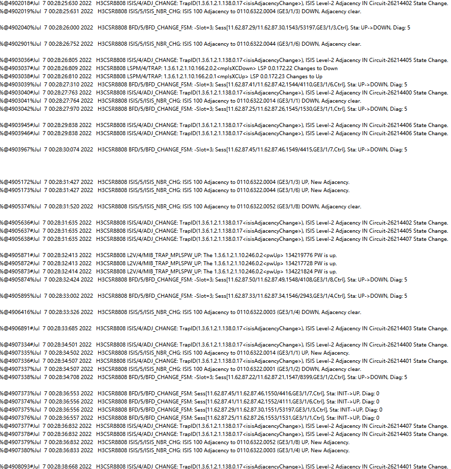 看到日志里面存在NTP服务器切换的动作。%@4902014#Jul 7 00:23:04:607 2022 H3CSR8808 SYSMIB/4/CLKCHANGE: Trap 1.3.6.1.4.1.25506.2.3.2.1<hh3cSysClockChangedNotification>: System clock changed. %@4902015#Jul 7 00:24:14:832 2022 H3CSR8808 SYSMIB/4/CLKCHANGE: Trap 1.3.6.1.4.1.25506.2.3.2.1<hh3cSysClockChangedNotification>: System clock changed. %@4902016#Jul 7 00:25:58:044 2022 H3CSR8808 SYSMIB/4/CLKCHANGE: Trap 1.3.6.1.4.1.25506.2.3.2.1<hh3cSysClockChangedNotification>: System clock changed. %@4902017#Jul 7 00:27:30:319 2022 H3CSR8808 SYSMIB/4/CLKCHANGE: Trap 1.3.6.1.4.1.25506.2.3.2.1<hh3cSysClockChangedNotification>: System clock changed. %@4902018#Jul 7 00:28:25:630 2022 H3CSR8808 ISIS/4/ADJ_CHANGE: TrapID(1.3.6.1.2.1.138.0.17<isisAdjacencyChange>), ISIS Level-2 Adjacency IN Circuit-26214402 State Change. %@4902019%Jul 7 00:28:25:631 2022 H3CSR8808 ISIS/5/ISIS_NBR_CHG: ISIS 100 Adjacency to 0110.6322.0004 (GE3/1/3) DOWN, Adjacency clear.