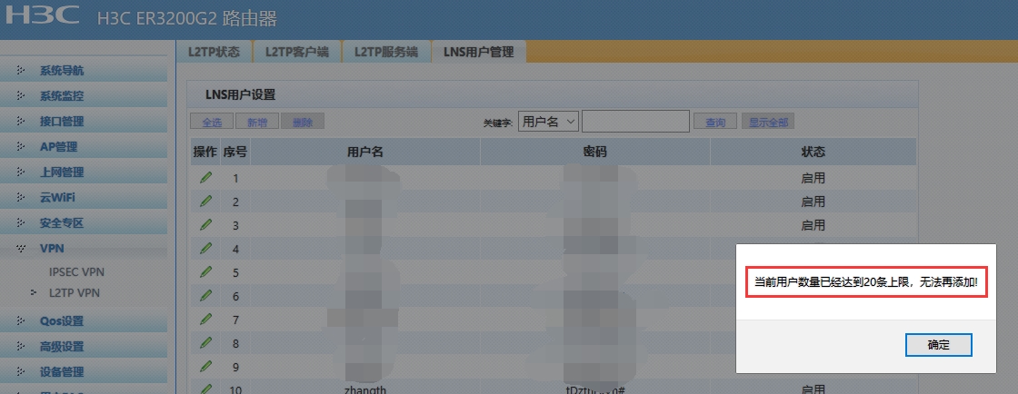 建立L2TP VPN账号时,后台提示用户数量已经达到20条,请问如何修改这个上限?我们现在希望不要有这个上限。