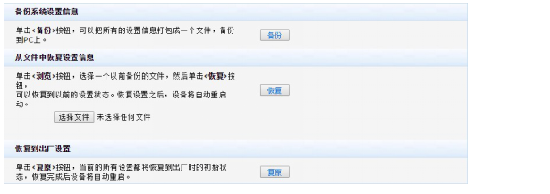 (1)恢复将清空全部配置,设备所有配置将恢复到出厂配置,请谨慎操作。