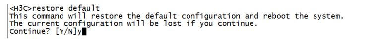 <H3C>提示进入设备命令行,命令行下输入:restore default命令并回车,再次输入Y确认后,路由器将恢复到出厂设置并重新启动,同时账号密码也恢复到初始配置,初始账号密码均为小写的admin。