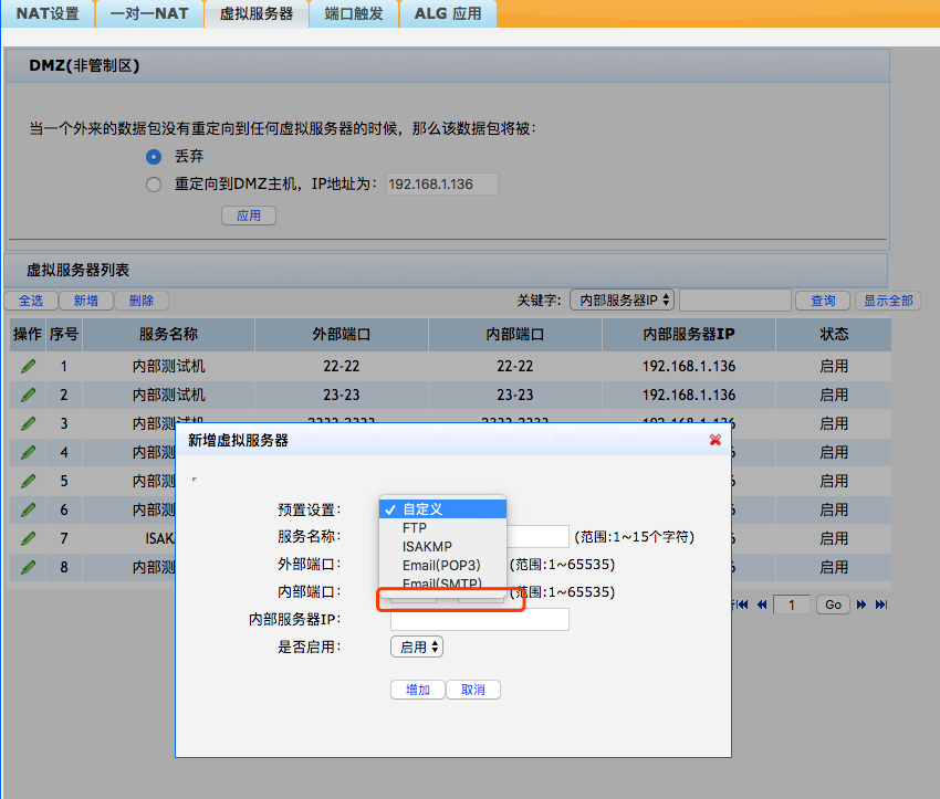 可是,我登录进去后,配置了配置了NAT虚拟主机后,映射到本地一个web服务器的时候,采用80端口,就访问不了啦。