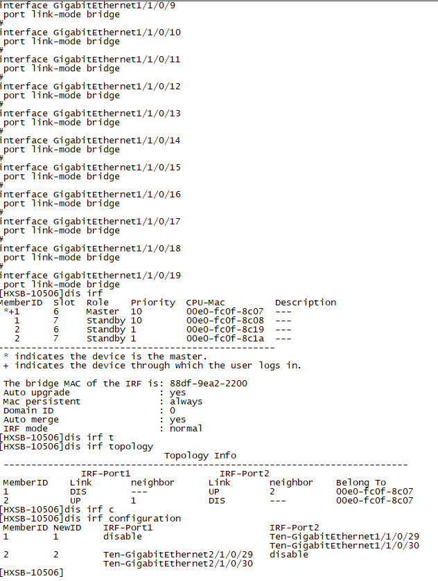 irf-port 1/2 port group interface Ten-GigabitEthernet1/1/0/29 mode enhanced port group interface Ten-GigabitEthernet1/1/0/30 mode enhanced #