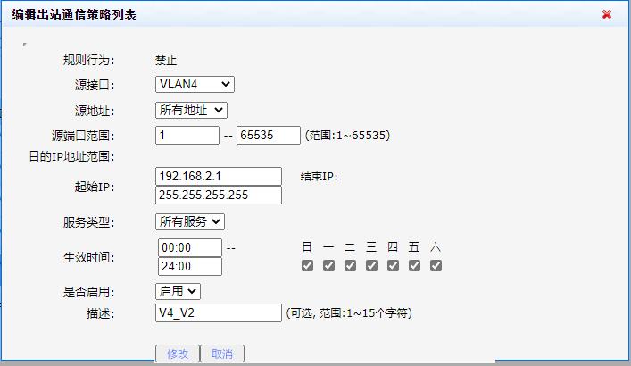 现在各VLAN间都是可以互访问的。为了让VLAN2、VLAN3、VLAN4间不能到访。在防火墙的出站访问里禁止了VLAN2、VLAN3、VLAN4间相互访问。VLAN2-VLAN3、VLAN2-VLAN4、VLAN3-VLAN2、VLAN3-VLAN4、VLAN4-VLAN2、VLAN4-VLAN3。共做了6条禁止互访规则。