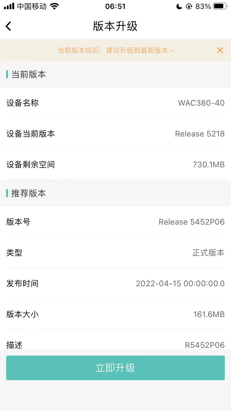 APP 上没得选择低点的版本。像我这种小白只能用这种方法升级。1、是不是升级AC 后,AP也得把版本升级? 2、AC升级后原来的配置还在吗?需要重新配置不