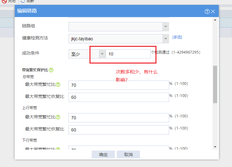 健康检测-成功条件 | 链路的健康检测成功条件。 · 全部检测通过:只有全部健康检测方法都通过检测才认为健康检测成功。 · 至少n个检测通过:健康检测成功所需通过检测的最少方法数为n。当用户指定的最少方法数n大于设备上实际存在的方法数量时,只要实际存在的全部方法通过检测,系统也将认为健康检测成功。 |
