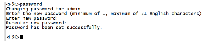 <H3C>提示进入设备命令行,输入password命令并回车,按照系统提示,提示:enter new password(输入新密码),则可以直接输入新密码,并重新输入一次确认即可。