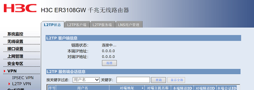 在路由器中配置L2TP VPN后,在外网设置VPN访问该网络能够连通,客户端也能够获取该路由器的IP地址,并且使用路由器IP可以访问路由器系统,但是不能访问内部网络的电脑设备,在L2TP的状态中客户端信息一直是连接中,如下图