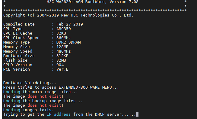 Protocol (FTP or TFTP) :tftp Load File Name :wa2600a_fat.bin : Target File Name :wa2600a_fat.bin : Server IP Address :192.168.1.54 Local IP Address :192.168.1.20 Subnet Mask :0.0.0.0 Gateway IP Address :0.0.0.0 ==========================<Enter Ethernet SubMenu>========================== |Note:the operating device is flash | |<1> Download Image Program To SDRAM And Run | |<2> Update Main Image File | |<3> Update Backup Image File | |<4> Download Files(*.*) | |<5> Modify Ethernet Parameter | |<0> Exit To Main Menu | |<Ensure The Parameter Be Modified Before Downloading!> | ============================================================================ Enter your choice(0-5): 2 Loading..................................................................... ............................................................................ ...................Done. 8245248 bytes downloaded! Saving file flash:/wa2600a_fat.bin ......................................... ............................................................................ ...........Done. Set the file attribute failed! ==========================<Enter Ethernet SubMenu>========================== |Note:the operating device is flash | |<1> Download Image Program To SDRAM And Run | |<2> Update Main Image File | |<3> Update Backup Image File | |<4> Download Files(*.*) | |<5> Modify Ethernet Parameter | |<0> Exit To Main Menu | |<Ensure The Parameter Be Modified Before Downloading!> | ============================================================================ Enter your choice(0-5):