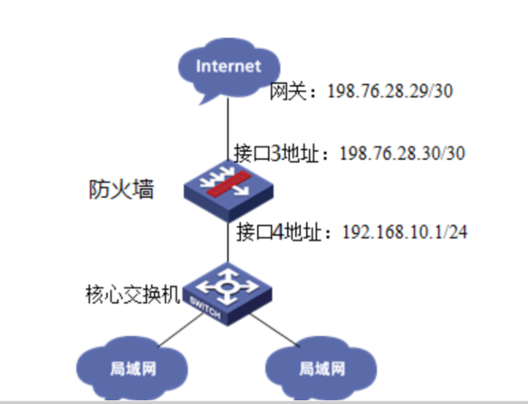 将防火墙部署在互联网出口,使用固定IP地址线路接入互联网。运营商提供的IP地址为198.76.28.30/30,网关为198.76.28.29DNS地址为114.114.114.114。初步规划防火墙使用3接口接入运营商,使用4接口连接内部网络,内部网络使用192.168.10.0网段,要求内网终端可以自动获取到地址并可以访问互联网。