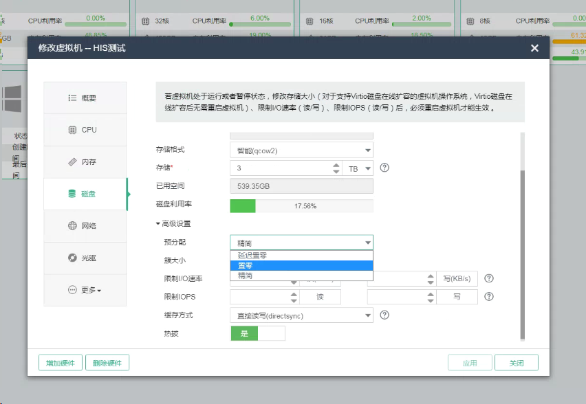 您好,可以先把预分配模式修改为“精简”,再去修改磁盘大小,最后改回“延迟置零”。 注意: 预分配模式修改需要关机操作,操作前请做好备份。