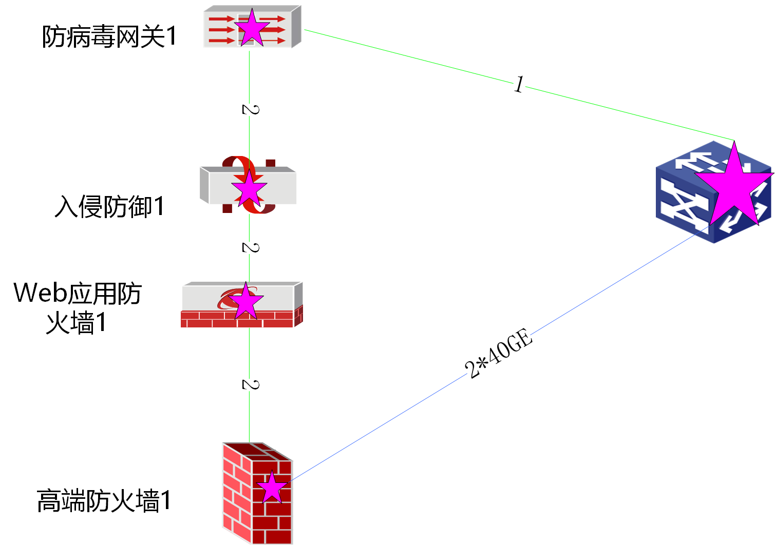 核心 -- vlan 99 -->防毒墙 -- vlan 99 --> ips -- vlan 99 --> waf-- vlan 99 -->给防火墙-- 三层 -->核心