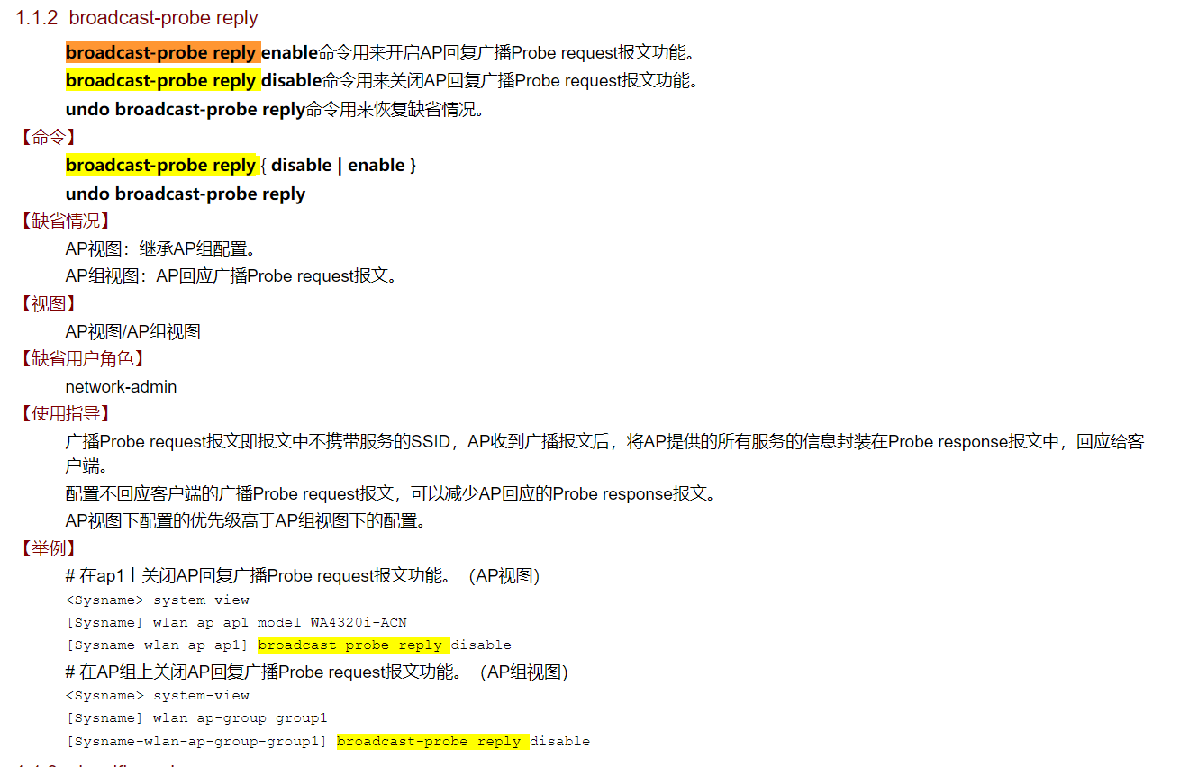 而大部分的无线终端都不会指定要链接的“无线接入服务”,这样就造成了无线终端会大量发送广播Probe Request探测,造成所有的接收到该报文的AP设备都会回应Probe Response报文。因此,在无线用户比较多的网络中,可能会出现一定量的Probe Response报文,而且这些报文都是使用低速率进行发送,会消耗一定的空间资源。如果网络条件允许可以考虑关闭广播Probe探测功能,AP针对SSID为空的探测请求不进行回复,有效降低空口的消耗,使整个WLAN网络应用得到一定的提升。