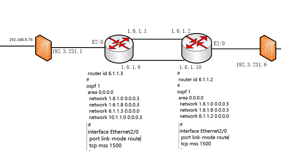 如图,这是我们公司的一个拓扑连接图,问题主要是在路由器这,我想知道ospf怎么network不用配E2/0口的ip,或者是网段?