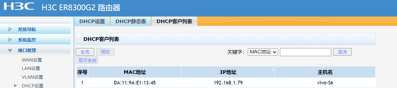页面向导:接口设置→DHCP设置→DHCP静态表
