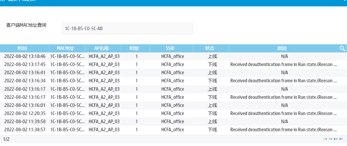 %Aug 2 13:16:34:048 2022 H3C STAMGR/6/STAMGR_CLIENT_OFFLINE: Client 1c1b-b5c0-5cab went offline from BSS 642f-c749-dae0 with SSID HCFA_office on AP HCFA_A2_AP_03 Radio ID 1. State changed to Unauth. Reason: Received deauthentication frame in Run state: reason code=1