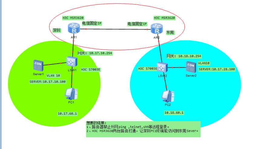 想要的结果(要在安全条件): 1、路由器禁止外网ping ,telnet,shh等远程登录。 2、H3C MSR3620两台路由打通,让深圳PC1终端能访问到东莞Sever。