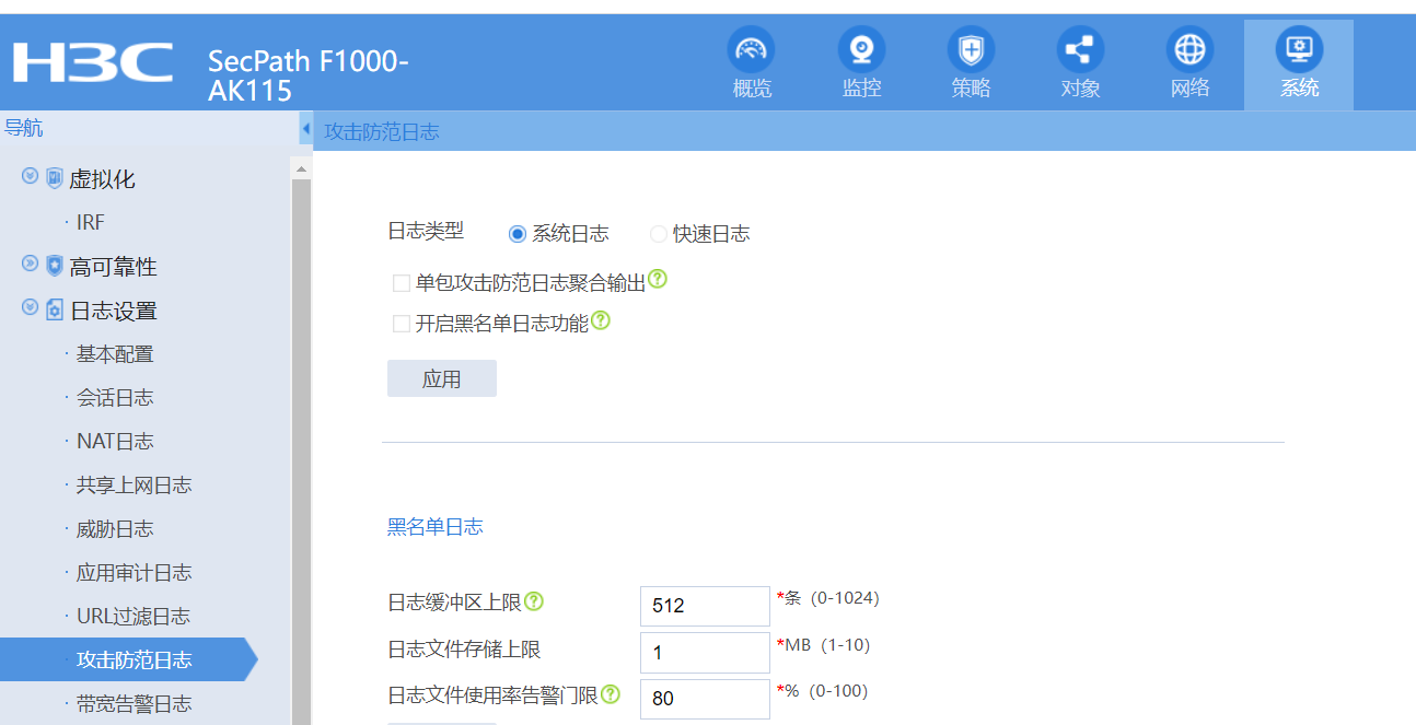 设备支持在“系统 > 日志设置 > 攻击防范日志”页面关闭单包攻击防范日志聚合输出功能,逐条输出单包攻击日志。但在单包攻击较为频繁的情况下,逐条输出会占用大量显示资源。所以通常不建议关闭聚合输出功能。