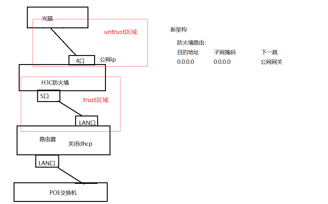 我跟负责配置我们路由器的工程师沟通后,他说,想要在他们路由器前面放一个防火墙,需要将防火墙的端口连接在路由器的LNA口上,同时关闭路由器的dhcp功能。