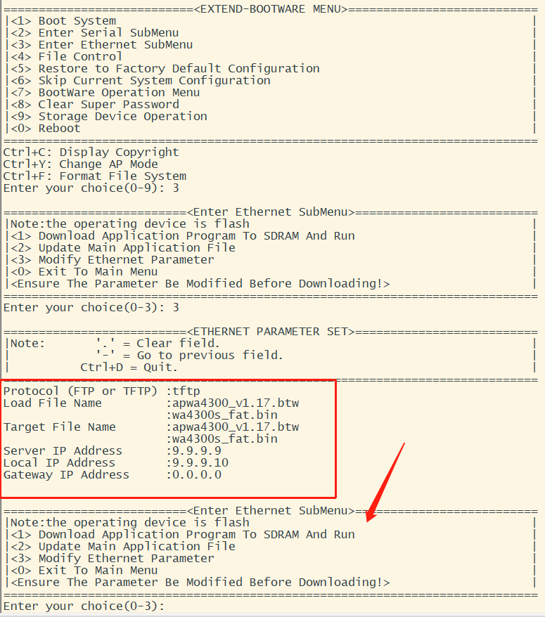 想把这个4320 AP刷成FAT模式呢,在Fit模式下的时候创建了个vlan接口IP地址是9.9.9.10,我电脑当时是9.9.9.9,上传了个FAT.bin,但是命令行一直无限重启,ping也ping不通FAT镜像默认的192.168.1.50这个IP地址。然后Ctrl+B在这个格式化了一遍,现在好像无法上传别的镜像了啊(尴尬),在这里好像也不能配置AP的IP地址与本地计算机互通。。按下图输入完tftp 的server ip 本机ip之后直接就跳到另一个菜单了,没有传输过程,求解。。第一次刷AP