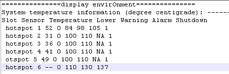 ===============display envirOnment=============== System temperature information (degree centigrade): ---------------------------------------------------------------------- Slot Sensor Temperature Lower Warning Alarm Shutdown 1 hotspot 1 52 0 84 98 105 1 hotspot 2 31 0 100 110 NA 1 hotspot 3 36 0 100 110 NA 1 hotspot 4 41 0 100 110 NA 1 hotspot 5 49 0 100 110 NA 1 hotspot 6 -- 0 110 130 137