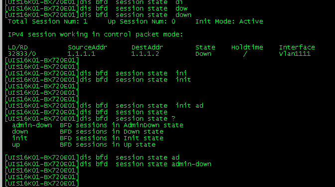 已在评论区贴图,BFD会话处于down状态。