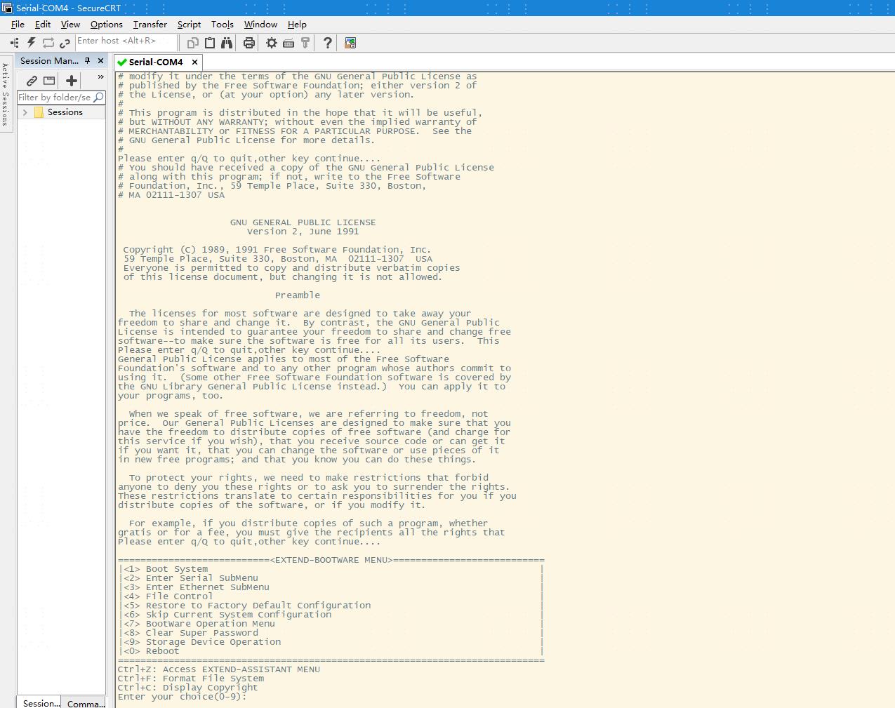 ===========================<EXTEND-BOOTWARE MENU>=========================== |<1> Boot System | |<2> Enter Serial SubMenu | |<3> Enter Ethernet SubMenu | |<4> File Control | |<5> Restore to Factory Default Configuration | |<6> Skip Current System Configuration | |<7> BootWare Operation Menu | |<8> Clear Super Password | |<9> Storage Device Operation | |<0> Reboot | ============================================================================ Ctrl+Z: Access EXTEND-ASSISTANT MENU Ctrl+F: Format File System Ctrl+C: Display Copyright Enter your choice(0-9):