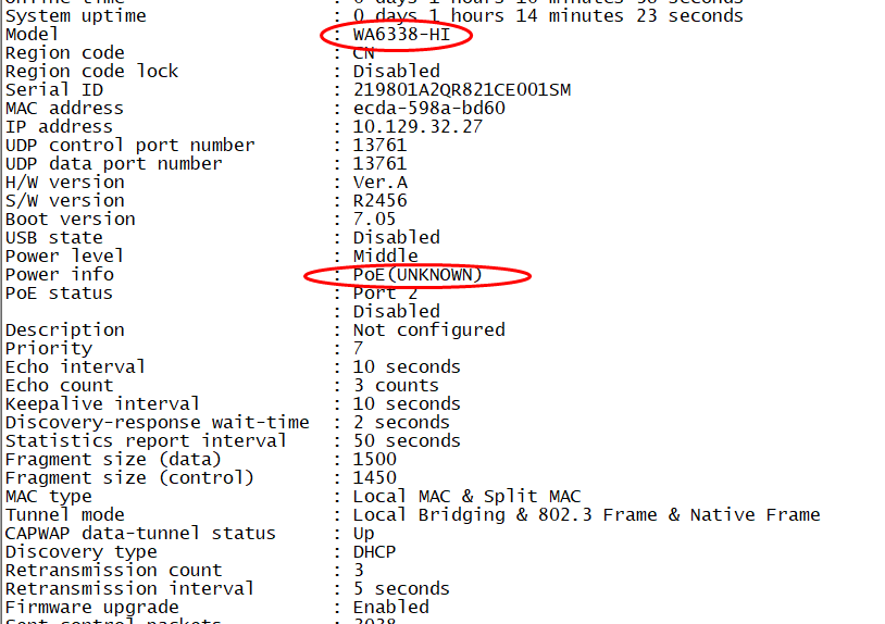 关于WA6338-HI的POE供电问题,官网彩页改型号支持802.3at,但ac侧查询到的有显示不明。