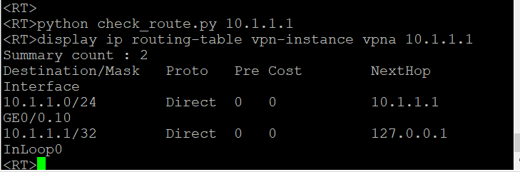 h3c的V7设备是自带python 2.x功能的,利用此特点,将check_route.py脚本上传给h3c设备,然后<>视图下python check_route.py X.X.X.X 就能检查vpn-instance路由表中到目的ip X.X.X.X的下一跳指向哪里