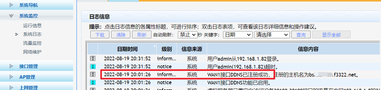 2022-08-16 17:20:27 informational 系统 由于无法连接服务器,WAN1接口DDNS注册失败。