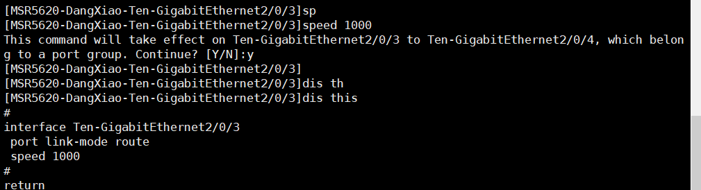 通过本命令可以配置MSR5620、SPU-200-X1、SPU-400-X1和SPE-S3的万兆以太网接口速率在10000Mbps和1000Mbps间切换,切换速率时需要重启设备/业务板才能生效。