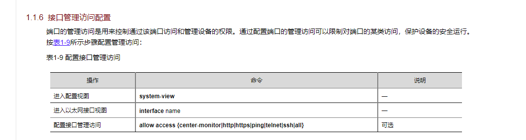 启用Telnet或SSH服务 | allow access {telnet | ssh} | 必选 |