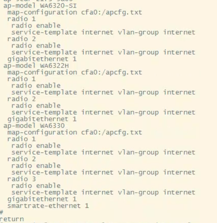 AP已经在AC上正常上线,在AC上创建了服务模板、ap组,且把AP也加入了组,做了相应的映射,配置都已经做完了;但是远程登录发现AP上没有任何配置,请教各位大佬是什么问题,麻烦各位大佬指导指导~~~