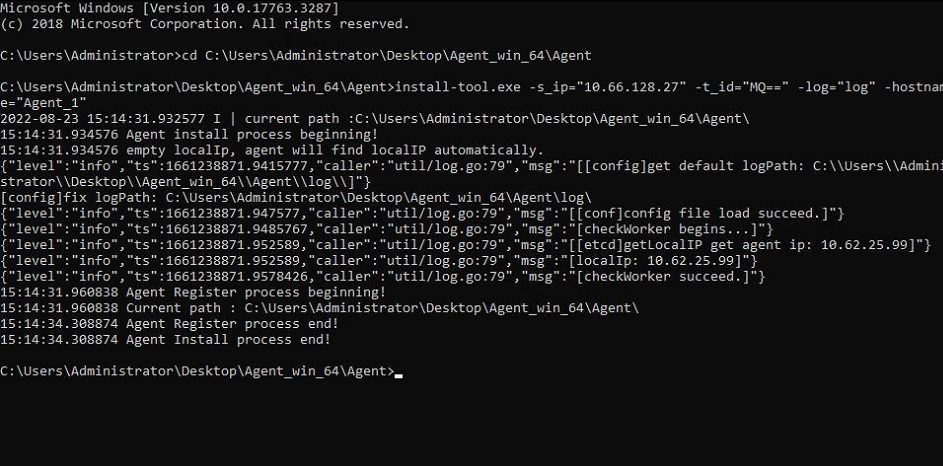使用命令安装:install-tool.exe -s_ip="10.66.128.27" -t_ -log="log" -hostname="Agent_1"