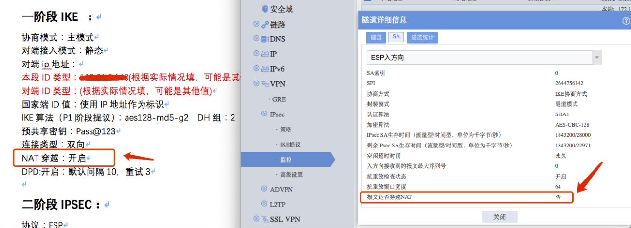 本端与对端建立了VPN隧道,隧道已建立,但是ping不通对方内网IP地址,查看隧道SA的详情显示NAT穿越未开启,找不到开启的位置或命令
