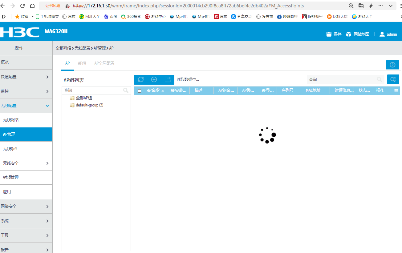 WA6320H刷了WA6300-CMW710-R2457版本软件,工作在ANCHOR AC模式下,下挂了1台WA6320H和1台wa6322h。发现web管理页面下 无线配置--AC管理 中无法显示AP,如下图,一致是转圈:
