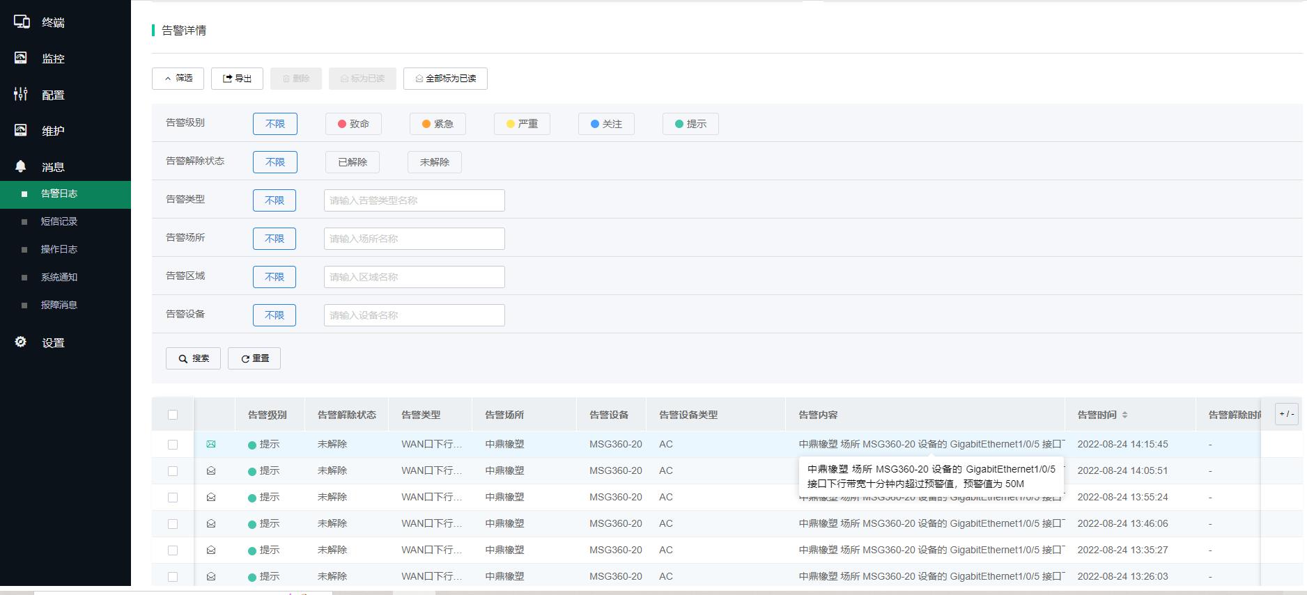 CPU利用率告警门限为70%,CPU利用率恢复门限为30%。