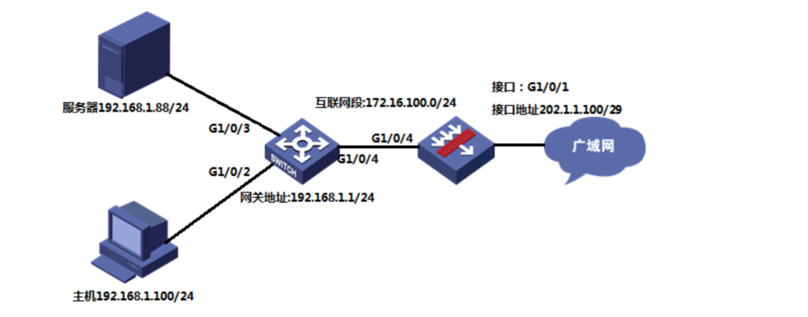 #在外网口GigabitEthernet1/0/1上配置内部服务器映射:允许外网用户通过公网地址202.1.1.100、端口8081访问内部服务器192.168.1.88的8081端口