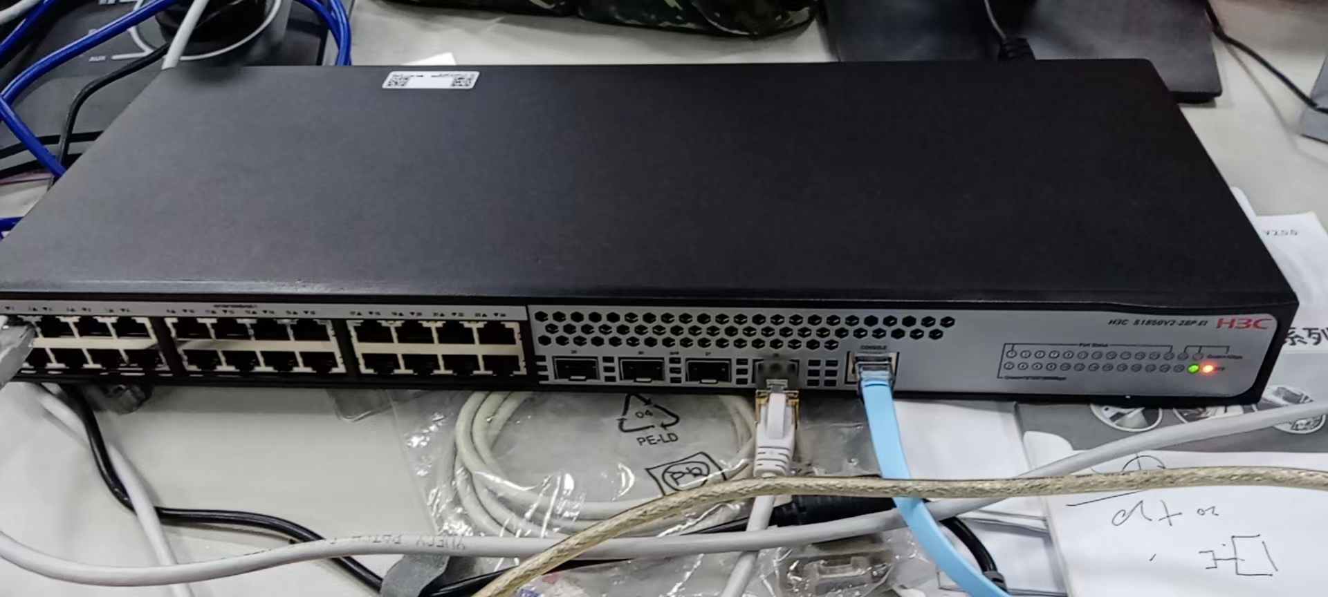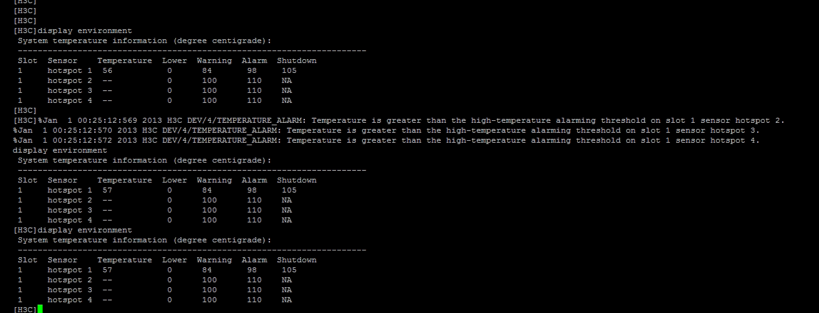 最近拿到1台全新的S1850V2-28P-EI交换机,设备通电启动后SYS灯一直亮红灯,CONSOLE进到交换机后,不断提示温度超限,如下图,