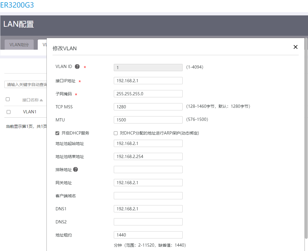 VLAN配置为VLAN1,IP地址改成了192.168.2.1(局域网网关地址),并开启DHCP模式。