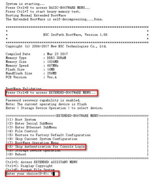 #设备启动过程中根据提示按 crtl+B进入 bootware界面,选择 <8>跳过 Console 密码认证