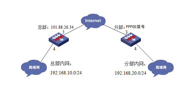 总部有公网固定地址,分支为pppoe拨号,请问如何实现分支之间的互通,有案例最好,谢谢了